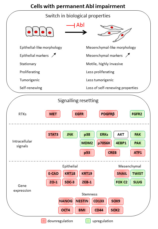 Figure 9: Permanent Abl ablation in GBM cells leads to a switch in biological properties and to a signalling resetting.