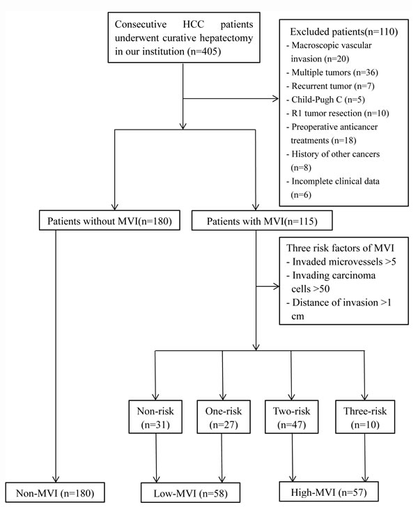 From January 2004 to December 2013, a total of 405 consecutive HCC patients underwent curative hepatectomy in our institution. To clearly evaluate the real prognostic impact of MVI, 110 patients were excluded for the following reasons: (1) macroscopic vascular invasion (n = 20), (2) multiple tumors (n = 36), (3) recurrent tumor (n = 7), (4) Child-Pugh C (n = 5), (5) R1 tumor resection (n = 10), (6) presence of any preoperative anticancer treatments (n = 18), (7) a history of other cancers (n = 8), (8) incomplete clinical data (n = 6) (Figure 1). The present study was carried out in accordance with the Declaration of Helsinki revised in 1983. The retrospective study was approved and exempted from the requirement to obtain informed consent by the Committee on Medical Ethics of Nanjing Drum Tower Hospital.