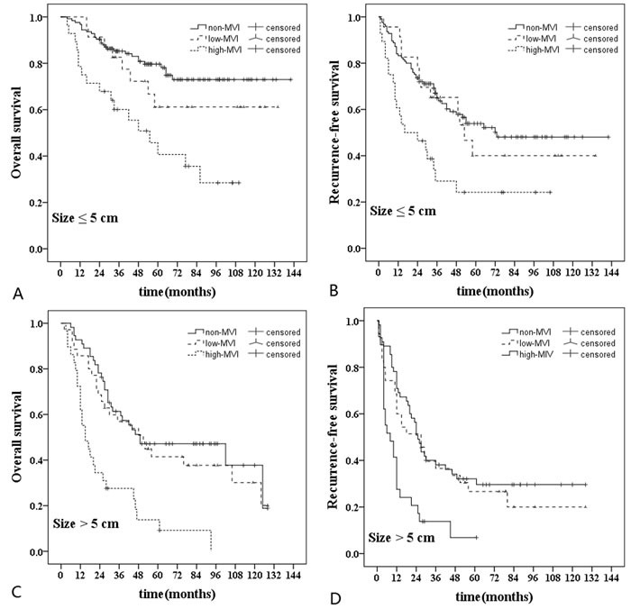 Figure 5: Subgroup analyses in hepatocellular carcinoma patients according to the tumor size. For tumor size ≤ 5 cm (n = 176), A., Comparison of overall survival rate: high-MVI vs non-MVI (P < 0.001); high-MVI vs low-MVI (P = 0.045); low-MVI vs non-MVI (P = 0.277). B., Comparison of recurrence-free survival rate: high-MVI vs non-MVI (P = 0.001); high-MVI vs low-MVI (P = 0.035); low-MVI vs non-MVI (P = 0.678). For tumor size > 5 cm (n = 119), C., Comparison of overall survival rate: high-MVI vs non-MVI (P < 0.001); high-MVI vs low-MVI (P < 0.001); low-MVI vs non-MVI (P = 0.404). D., Comparison of recurrence-free survival rate: high-MVI vs non-MVI (P < 0.001); high-MVI vs low-MVI (P = 0.006); low-MVI vs non-MVI (P = 0.341).