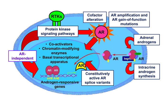 Figure 1: Molecular mechanisms driving CRPC. Development of CRPC has been attributed to numerous potential molecular mechanisms, including: 1) somatic mutations of AR resulting in increased affinity for ligands; 2) amplification of the AR gene locus; 3) intracrine biosynthesis of androgens in prostate cancer cells from adrenal steroids and cholesterol; 4) expression of constitutively active, ligand-independent AR splice variants; 5) non-canonical activation of AR by protein kinase signaling pathways in the absence of ligand by receptor tyrosine kinases (RTK); 6) AR-independent mechanisms operating outside of the AR signaling axis which promote castrate-resistant growth of prostate cancer.