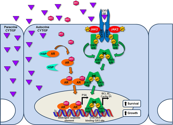 Figure 2: Canonical Jak2-Stat5a/b signaling in prostate cancer cells and functional interaction with AR signaling. Various levels of inhibition are possible in the Stat5a/b signaling cascade to block Stat5a/b target gene expression, including targeting of cytokine receptor activation, Jak2 kinase-mediated phosphorylation, and Stat5a/b dimerization, DNA binding and transcriptional activity. Physical interaction between Stat5a/b and AR has been reported, providing a mechanistic basis for crosstalk between these two pathways, which results in reciprocal synergistic effects on nuclear localization and transcriptional activity. Depicted are known Stat5a/b target genes Bcl-xL and cyclin D1 and AR target gene PSA. Abbreviations: AR, androgen receptor; ARE, androgen response element; CYT, cytokine; CYTR, cytokine receptor; DHT, dihydrotestosterone; GAS, gamma-interferon activation sequence; GF, growth factor; HSP, heat shock protein; pY, phosphotyrosine.