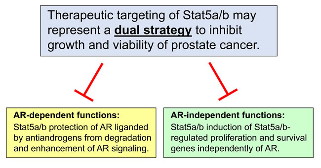 Figure 3: Therapeutic targeting of Stat5a/b inhibits growth of prostate cancer through AR-dependent and AR-independent mechanisms. Disruption of Stat5a/b signaling inhibits growth and viability of prostate cancer through two distinct mechanisms, serving as a potential dual strategy to eliminate prostate cancer cells. First, targeting of Stat5a/b inhibits the abilities of Stat5a/b to protect antiandrogen-liganded AR from proteasomal degradation and enhance AR signaling, including downstream molecular events such as AR nuclear localization, chromatin binding, and activation of target gene expression in prostate cancer cells. Second, targeting of Stat5a/b prevents the induction of AR-independent, Stat5a/b-regulated genes involved in proliferation and survival of prostate cancer cells.