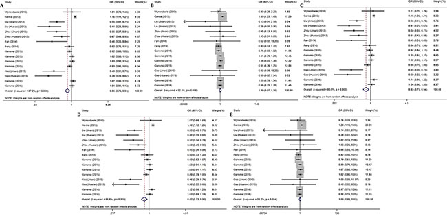 Figure 2: Forest plots for the association between the rs4245739 polymorphisms and cancer risk under five genetic models (A) allelic model; (B) homozygous model; (C) heterozygous model; (D) dominant model; (E) recessive model.