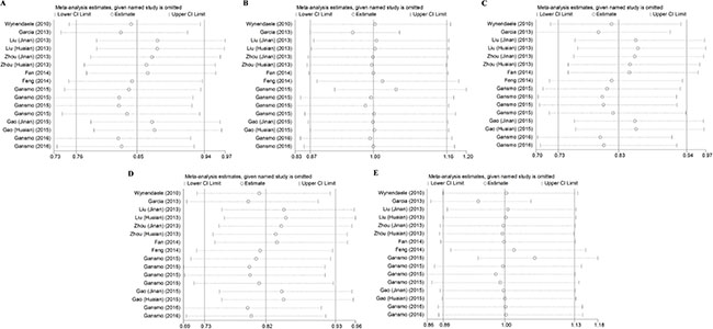 Figure 3: Leave-one-out analysis of association between the rs4245739 polymorphisms and cancer risk under five genetic models (A) allelic model; (B) homozygous model; (C) heterozygous model; (D) dominant model; (E) recessive model.
