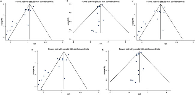 Figure 4: Funnel plots for the association between the rs4245739 polymorphisms and cancer risk under five genetic models (A) allelic model; (B) homozygous model; (C) heterozygous model; (D) dominant model; (E) recessive model.