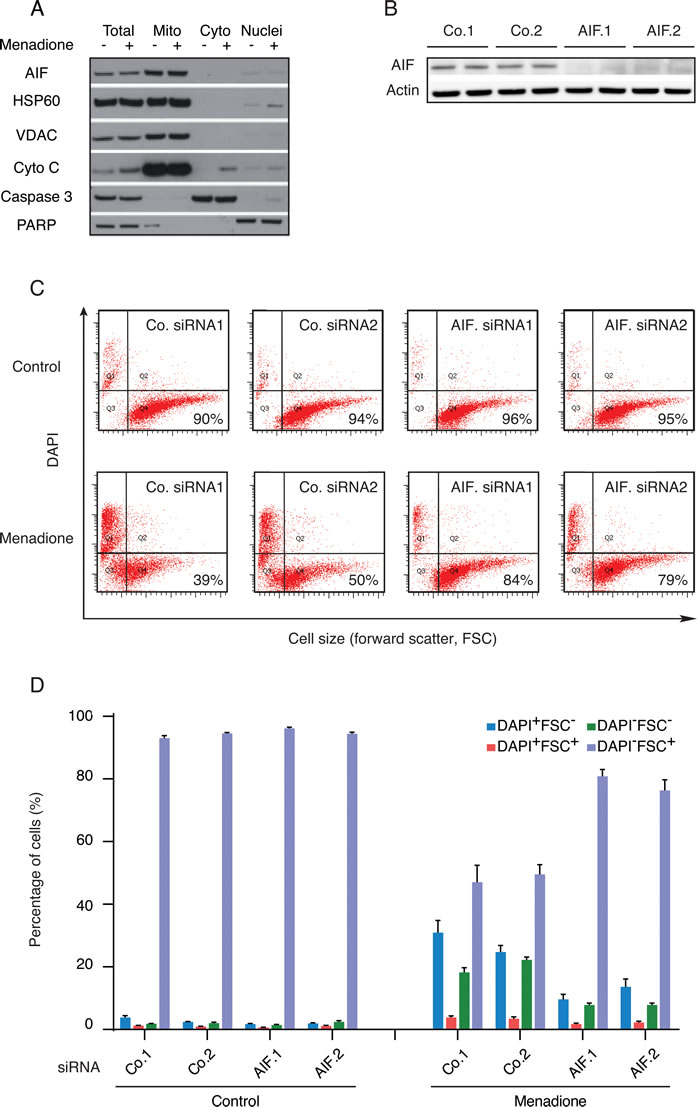 Figure 1: Impact of AIF expression on the cytotoxicity of menadione. A. After 3h treatment with (+) or without (-) 50µM menadione, the subcellular localization of AIF in U2OS cells was checked by immunoblot in the indicated fractions, using antibodies directed against proteins localized in mitochondria (HSP60, VDAC and cytochrome c), cytosol (caspase-3) or nuclei (PARP). B. Extracts of U2OS cells (duplicates) subjected to the transfection with AIF-specific (AIF.1 and AIF.2) or control (Co.1 and Co.2) siRNA were analyzed by immunoblot for the abundance of AIF. Actin was used as a loading control. C. D. U2OS cells transfected with two distinct control siRNAs (Co.1 and Co.2) or two distinct, non-overlapping siRNAs targeting AIF (siRNA AIF.1 and AIF.2) were treated with 50µM menadione or the solvent (Control) for 3h and drug-induced cell death was quantified by flow cytometric assessment (pictograms shown in C; histograms shown in D) of DAPI uptake (DAPI positivity) and forward light scatter (FSC) analysis that allows for the identification of apoptotic cells according to their reduced size (low FSC). Data are expressed as mean values ± SEM.