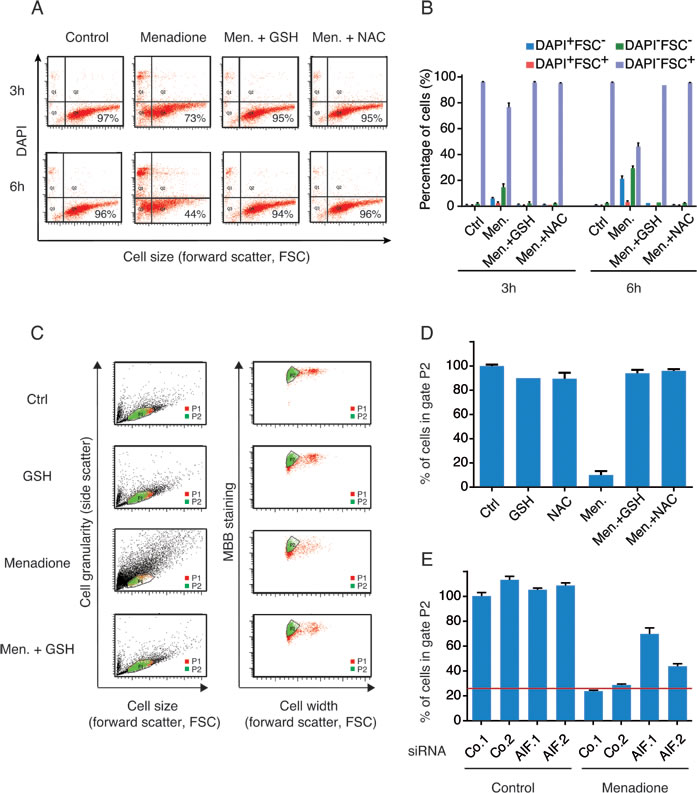 Figure 4: The loss of GSH levels in menadione-treated cells correlates with the expression level of AIF. A., B. Effect of exogenous antioxidants on menadione-induced death was evaluated by incubating U2OS cells, for 3h or 6h, with 50µM of menadione in the absence or presence of GSH (5 mM) or NAC (5 mM). Cell death was quantified by flow cytometric assessment (pictograms are shown in A and histograms in B) of DAPI uptake (DAPI positivity) and forward light scatter (FSC) analysis that allows the identification of apoptotic cells. C., D. A cytofluorimetric analysis combined with the use of the thiol-reactive probe monobromobimane (MBB) was set up to measure levels of reduced glutathione in cells treated with menadione (pictograms are shown in C and histograms D). After menadione treatment, in absence or presence of exogenous antioxidants (GSH or NAC), live cells (Topro3 negative), exhibiting size and granularity parameters similar to control untreated cells (gate P1), were analyzed for their staining with MBB (gate P2). Cell width assessment by forward light scatter (FSC) analysis was used to discriminate between singlet cells and aggregates. For each treatment condition, the percentage of cells stained with MBB (gate P2) was quantified (D). E. The effect of AIF knockdown on the levels of GSH was monitored, as described in (C and D), after transfection with two distinct control siRNAs (Co.1 and Co.2) or two distinct, non-overlapping siRNAs targeting AIF (siRNA AIF.1 and AIF.2) and culture with 50 µM of menadione for 3h. Data are expressed as mean values ± SD.