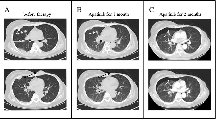 This patient is a 52- year- old woman, who had experienced a benign tumorectomy of left mammary glands 4 years ago. One and a half years ago, she found a lump sized like a peanut kernel in the left breast by chance, which enlarged gradually during the following one month to a lump sized like a common quail egg. Histopathology examination of biopsy sample revealed spindle cell carcinoma by H&E staining (Figure 1A). Subsequently, a modified radical mastectomy had been performed. Histopathology combined with immunohistochemisty results showed a triple-negative (ER/PR/HER2) spindle cell carcinoma (Figure 1). This tumor has a basal epithelial phenotype with expression of high molecular weight cytokeratins 5/ 6, and epithelial marker p63 are also expressed. The spindle-shaped cells are negative for both vimentin and cytokeratin. (Figure 1). These biomarkers also excluded a diagnosis of others spindle cell lesions such as sarcoma. After 6cycles of adjuvant chemotherapy with Cyclophosphamide and Epirubicin, a Positron Emission Tomography/computed tomography (PET-CT) scan was done. It indicated multiple metastases in bilateral lung and left anterior thoracic wall. For obtaining better treatment, she came to our hospital. Physical examination showed consciousness was clear, with poor spirit and chronic faces, no stained yellow on skin and mucous membrane, and no touched swelling of superficial lymph nodes. The patient had got Asthma in 1995 and had no history of hypertension, diabetes, and heart disease. Combining with her tumor history, performance and chemotherapy regimen, we first performed precise diagnosis with genetic testing. The mRNA expression levels of several angiogenesis related genes and classic mutation sites of EGFR were tested by liquid phase chip and ARMS PCR using her surgery sample, which showed a high expression level of Vascular Endothelial Growth Factor Receptor1 (VEGFR1) and a medium expression level of VEGFR2. Moreover, there is no classic mutation of EGFR (Table 1). We then carried out next generation sequencing (NGS) using the same surgery sample, which showed numbers of mutated genes but no matched targeted therapy (Table 2). Aiming at the high VEGFR expression, bevacizumab combined with chemotherapy of Albumin-bound Paclitaxel and Cisplatin was started one week later. Metastatic nodules in lungs became smaller revealed by CT scanning after 3 cycles. However, after another 2cycles, CT scan showed disease progression at all metastatic sites with increased diameters and pleural effusion. Finally, because of the medium expression of VEGFR2, the patient was treated with Apatinib after signing informed consent and confirmed by the hospital ethics committee approval. Before Apatinib therapy, metastatic nodules in the middle lobe of right lung, pleura and left anterior thoracic wall were found by CT scan (Figure 2A). Remarkably, the mass in the left anterior thoracic wall shrank significantly only one week after 500mg/day Apatinib administration. After 1 cycle Apatinib treatment, CT scan showed that the metastatic nodules in pleura, left anterior thoracic wall and bilateral lungs became smaller or almost disappeared. In addition, pleural effusion was improved significantly (Figure 2B).Following an additional one month of Apatinib treatment, pulmonary metastasis further decreased and so as that in pleura and left anterior thoracic wall. It’s worth noting that pneumatothorax appeared because of shrinkage of the pleura lesion, which could be controlled by symptomatic treatment (Figure 2C). To monitor the real-time effect of Apatinib on patient’s gene mutation status, we carried out NGS detection of circulating tumor DNA (ctDNA) from peripheral blood before therapy and after 2 months therapy. The two NGS results were consistent with therapeutic effect, in which number of mutated genes decreased after Apatinib therapy (Table 3). During the therapy, the drug dose was decreased to 250mg/day due to hypertension and hand-foot syndrome until they were totally tolerated. Until now, therapy with Apatinib was continued for 8 months, and the patient was in good general condition after the initiation of Apatinib (data lock, January 2016). The whole timeline of treatment is organized as Figure 3.