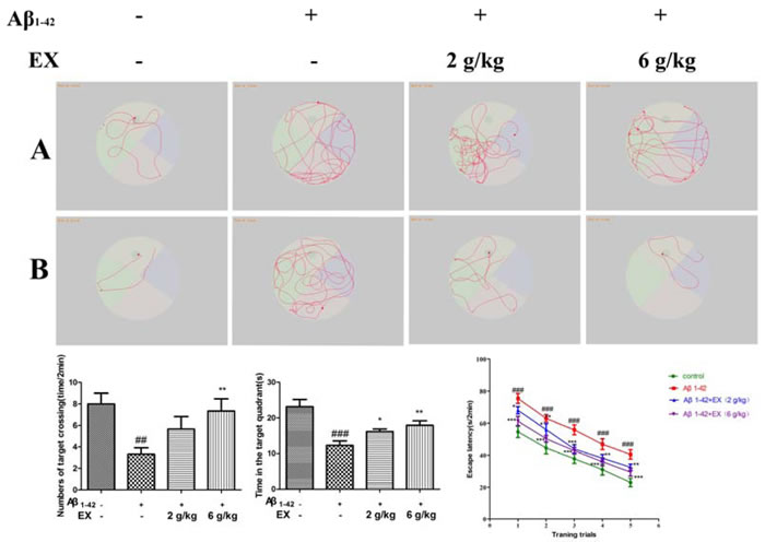 One day after the operation, the Aβ1-42-treated rats were randomly divided into 3 groups as follows: group 2 (n = 8) that served as model group received the PBS (p.o.); group 3 (n = 8) and 4 (n = 8) received EX at the doses of 2 g/kg and 6 g/kg (p.o.), respectively. Meanwhile, PBS-intrahippocampal injected rats served as control group (n = 8) received the PBS (p.o.). The drugs were orally administered through feeding tube daily for 30 consecutive days.
