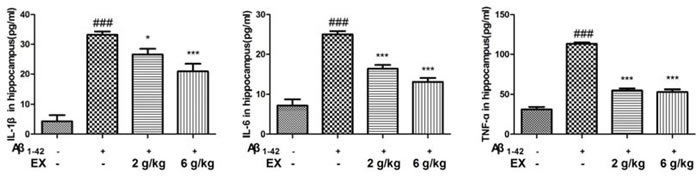 Figure 3: Effects of EX on pro-inflammatory cytokines (IL-1β, IL-6 and TNF-α) in hippocampus of Aβ1-42-induced rats. Data were expressed as mean ± S.E.M. (n = 8). ##p < 0.01 and ###p < 0.001 versus the control; * p < 0.05, ** p < 0.01 and *** p < 0.001 versus the Aβ1-42-treated group. Data were analyzed with ANOVA followed by Duncan’s Multiple Range Test.