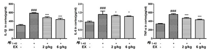 To assess the impact of EX on the Aβ1-42-mediated inflammatory response, the ELISA kits were applied to determine the production of IL-1β, IL-6 and TNF-α. As shown in Figure 3-4, the elevated levels of IL-1β, IL-6 and TNF-α significantly were found in the mice which were subjected to intrahippocampal Aβ1-42 injection. However, EX treatments (2 g/kg, 6 g/kg) significantly declined the production of IL-1β, IL-6 and TNF-α in the hippocampus and cortex after intrahippocampal Aβ1-42 injection. These results demonstrated that EX might ameliorate Aβ1-42-induced overproduction of pro-inflammatory cytokines, which was evidenced by the reverse effect of EX on the increase in the levels of IL-1β, IL-6 and TNF-α.