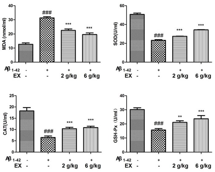 Figure 5: Effects of EX on the levels of SOD, MDA, CAT, GSH-Px in serum of Aβ1-42-induced rats. The data expressed as mean ± S.E.M (n = 8). #p < 0.05, ##p < 0.01 and ###p < 0.001 versus the control; * p < 0.05, ** p < 0.01 and *** p < 0.001 versus the Aβ1-42-treated group.