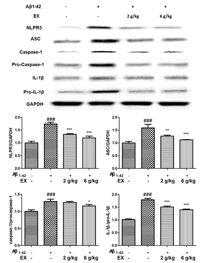 Figure 7: Effects of EX on the activation of NLRP3 inflammasome-related protein of Aβ1-42-induced rats. The data expressed as mean ± S.E.M (n = 3). #p < 0.05, ##p < 0.01 and ###p < 0.001 versus the control; * p < 0.05, ** p < 0.01 and *** p < 0.001 versus the Aβ1-42-treated group.