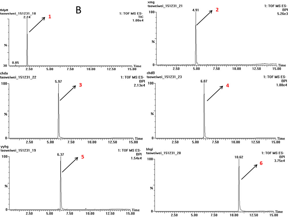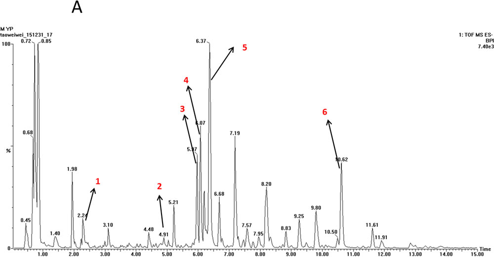 The typical TOF-MS chromatogram of EX was shown in Figure 1. By comparing both the retention times of the reference standards and the spectra of MS, six compounds, including Orcinol glucosid (1), Curculigoside (2), Epimedin A (3), Epimedin B (4), Icariin (5), Baohuoside I (6) were well indentified.
