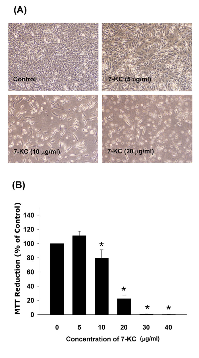 Figure 1: Cytotoxicity of 7-KC (10-40 µg/ml) to endothelial cells after 3 days of exposure. A. Morphologic changes of EAHY endothelial cells after exposure to different concentrations of 7-KC, B. Cyotoxicity of 7-KC to endothelial cells as analyzed by MTT. Results were expressed as Mean ± SE (n = 6). *denotes statistically significant difference (p < 0.05) when compared with solvent control.