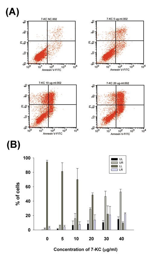Briefly 5 × 105 EAHY cells were seeded onto 6-well culture plates. After 24 h, culture medium was changed and then various amounts of 7-KC (final 5, 10, 20, 30, 40 µg/ml) or DMSO were added. Cells were further incubated for 24 hours. Then both the floating and attached cells were harvested. Cells were then washed with PBS, resuspended in 400 μl HEPES (10 mM HEPES-NaOH, pH 7.4, 140 mM NaCl, 2.5 mM CaCl2) solution, and the Annexin V-FITC (Becton Dickson)/ PI (50 μg/ml) staining solution was added in the dark for 30 min. The Annexin V-FITC and PI fluorescence of cultured cells were analyzed by FACSCalibur Flow Cytometry immediately as described before [35]. In each analysis, 15,000 events were recorded.