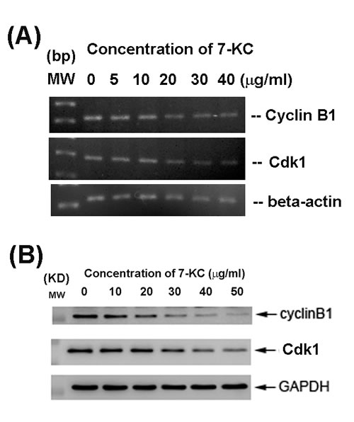 Figure 4: Effect of 24-h exposure to 7-KC on cell cycle-related Cdk1 and cyclin B1 mRNA and protein expression of endothelial cells. A. mRNA expression of Cdk1 and cyclin B1 as analyzed by PCR. Beta-actin expression was used as control. MW (molecular weight - base pairs [bp]) B. Cdk1 and cyclin B1 protein expression as analyzed by western blotting. MW (molecular weight, KD), Expression of beta-actin and GAPDH was used as control for PCR and western blot, respectively. One representative RT-PCR and western blotting result was shown.