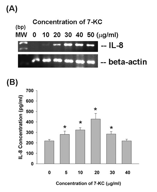 Figure 6: Effect of 7-KC on IL-8 expression and production. EAHY endothelial cells were exposed to 7-KC. A. Total RNA was isolated and subjected to RT-PCR analysis of IL-8 expression, B. Culture medium was collected and used for measurement of IL-8 secretion in endothelial cells. Results were expressed as Mean ± SE (n = 5).