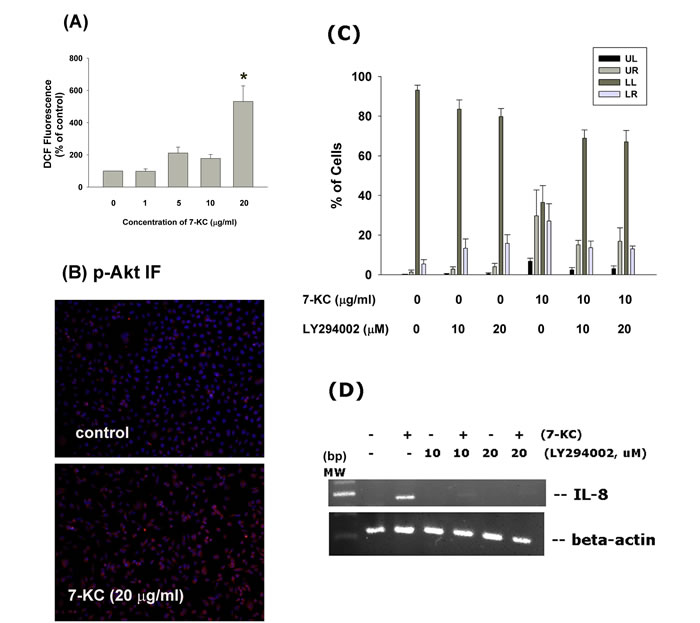 Figure 7: Effect of 7-KC on cellular ROS levels and Akt activation. A. 7-KC (10-40 µg/ml) induced ROS production as shown by increase in cellular DCF fluorescence. Results were expressed as Mean ± SE (% of control, n = 3), B. 7-KC stimulate Akt phosphorylation as shown by increase in cellular p-Akt fluorescence (blue - DAPI, red - p-Akt). One representative immunofluorescent study was shown. C. LY294002 attenuated the 7-KC-induced apoptosis of endothelial cells as analyzed by PI+Annexin V dual staining flow cytometry. Results were expressed as percentage (% of control, n = 6) of cell residing in UL, LL, UR and LR area of flow cytometry chart. D. LY294002 prevented the 7-KC-induced IL-8 mRNA expression of endothelial cells.