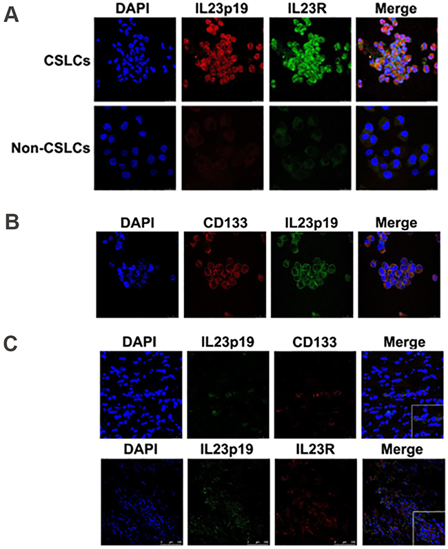 Figure 2: IL-23 and IL-23R expression in ovarian CSLCs. A. Immunofluorescence detection of both IL-23p19 and IL-23R expression in A2780-derived CD133+ and CD133- cells. B. Immunofluorescence detection of CD133 and IL-23p19 positive cells derived from A2780 cells. C. Immunofluorescence detection of IL-23p19 and CD133 positive as well as IL-23p19 and IL-23R positive cells isolated from primary ovarian cancer tissues. Scale bars, 25μm and 100μm.
