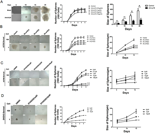 Figure 3: IL-23 is required for self-renewal capacity of CD133+ CSLCs. A. A2780-derived CD133+ cells were dissociated into 100 and 1 cells and stimulated by different concentrations of IL-23p19 neutralizing antibody for 6 and 20 days. The number and size of spheres were measured. B. Control shRNA (vector) or IL-23p19-shRNA transfected CD133+ A2780 cells were dissociated in 100 and 1 cells and incubated for 7 and 15 days. The number and size of spheres were measured. C, D. A2780-derived (C) and SKOV3-dereved (D) CD133+ cells were dissociated into 100 and 1 cells and stimulated by different concentrations of IL-23 inhibitor STA-5326 for 5 and 15 days. The number and size of spheres were measured. All experiments were performed three times and data are expressed as mean ± SD. *P<0.05, **P<0.01, ***P<0.001.