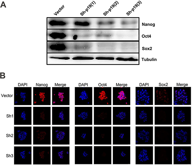 Figure 4: IL-23 is required for stable expression of stem cell markers in CD133+ CSLCs. A. Representative western blot analysis of Nanog, Oct4 and Sox2 expression in Control shRNA (vector) or IL-23p19-shRNA transfected CD133+ A2780 cells. B. Immunofluorescence detection of Nanog, Oct4 and Sox2 expression in Control shRNA (vector) or IL-23p19-shRNA transfected CD133+ A2780 spheres. Scale bars, 25μm.