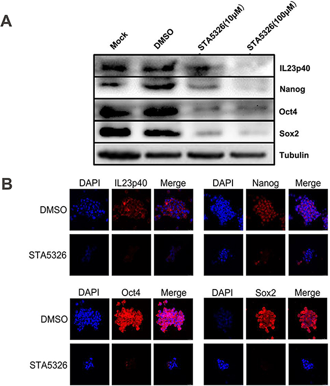 Figure 5: IL-23 is required for stable expression of stem cell markers in CD133+ CSLCs. A. A2780-derived CD133+ spheres were pretreated with DMSO or different concentrations of STA-5326 for 48h or untreated (Mock). The protein extracts were subjected to western blot analysis. Representative results of Nanog, Oct4, Sox2 and IL-23p40 expression are shown in each group. B. A2780-derived CD133+ spheres were pretreated with DMSO or different concentrations of STA-5326 for 48h. Immunofluorescence detection was performed in each group. Scale bars, 25μm.