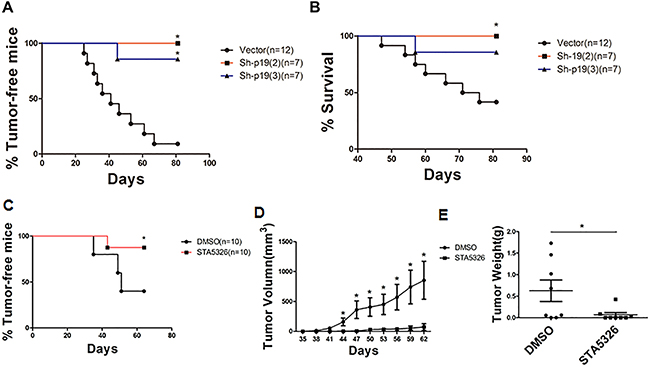 Figure 6: IL-23 mediates the growth of ovarian cancer xenografts in vivo. A, B. A2780-derived CD133+ CSLCs (5 × 105 per mouse) transfected with Control shRNA (vector) or IL-23p19-shRNA were injected subcutaneously into female nude mice and observed for 3 months before mice were killed. Tumor incidence (A) and survival rate (B) in each group are shown. C-E. A2780-derived CD133+ CSLCs (5 × 105 per mouse) pretreated with IL-23 inhibitor ST-5326 (10μM) or DMSO for 48h were injected subcutaneously into female nude mice and observed for 2 months before mice were killed. Tumor incidence (C), xenografts tumor volumes (D) and weight of xenografts tumor (E) at day 62 are shown. Experiments were performed three times and data are expressed as mean ± SD. *P<0.05.