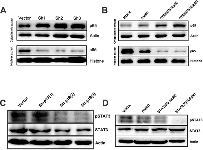 Figure 7: STAT3 and NF-κB signaling pathways are involved in IL-23-promoted self-renewal of CD133+ CSLCs. A. Western blot analysis of p65 levels in cytoplasmic extract and nuclear extract from A2780-derived CD133+ CSLCs transfected with Control shRNA (vector) or IL-23p19-shRNA. B. Western blot analysis of p65 levels in cytoplasmic extract and nuclear extract from A2780-derived CD133+ CSLCs pretreated with DMSO or different concentrations of IL-23 inhibitor ST-5326 for 48h or untreated (Mock). C. Western blot analysis of p-STAT3 and STAT3 levels in total protein extracts from A2780-derived CD133+ CSLCs transfected with Control shRNA (vector) or IL-23p19-shRNA. D. Western blot analysis of p-STAT3 and STAT3 levels in total protein extract from A2780-derived CD133+ CSLCs pretreated with DMSO or different concentrations of IL-23 inhibitor STA-5326 for 48h or untreated (Mock).