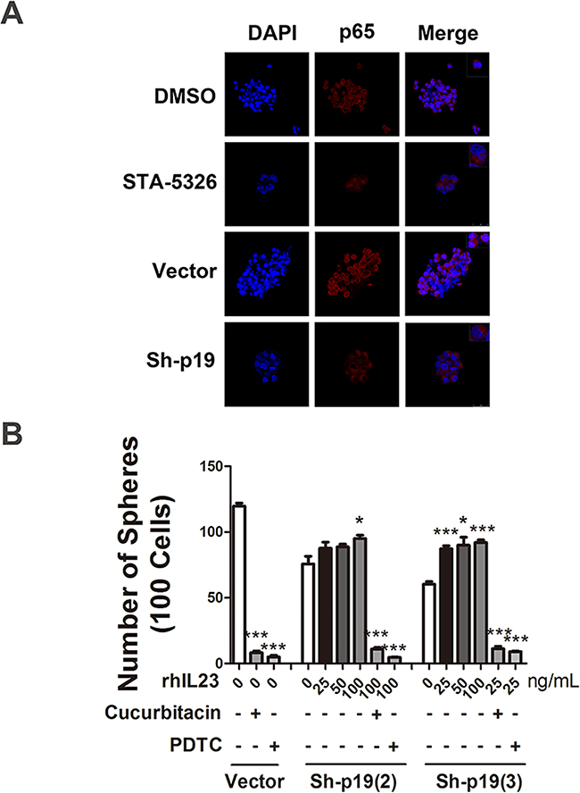 Figure 8: STAT3 and NF-κB signaling pathways are involved in IL-23-promoted self-renewal of CD133+ CSLCs. A. Immunofluorescence detection of p65 nuclear translocation in A2780-derived spheres transfected with Control shRNA (vector) or IL-23p19-shRNA and pretreated with DMSO or IL-23 inhibitor ST-5326 (10μM) for 48h. The upper right corner of the figures present the cell morphology with enlarged images. B. A2780-derived CD133+ cells transfected with Control shRNA (vector) or IL-23p19-shRNA were dissociated into 100 cells and stimulated with different concentrations of recombinant human IL-23, STAT3 signaling pathway inhibitor Cucurbitacin and NF-κB signaling pathway inhibitor PDTC. Sphere numbers were counted in each group. All experiments were performed three times and data are expressed as mean ± SD. *P<0.05, **P<0.01, ***P<0.001.