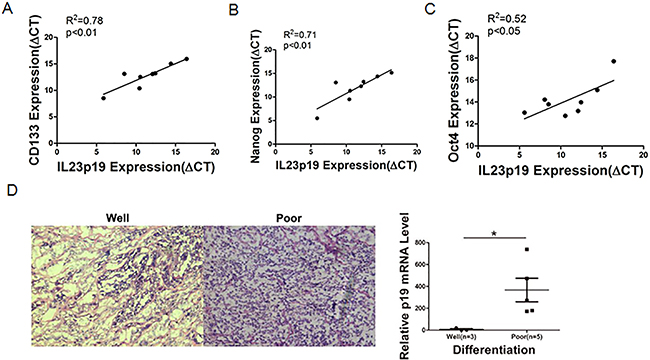 Figure 9: Correlation between IL-23p19 expression and CD133, Nanog, Oct4 levels and degrees of differentiation in primary ovarian cancer tissue. A-C. Correlation of gene expression levels between IL-23p19 and CD133, Nanog and Oct4 in primary samples, as measured by qRT-PCRn. D. Representative H&E staining of well and poor degrees of differentiation in primary samples (left panel) and its relationship with IL-23p19 levels. Experiments were performed three times and data were expressed as mean ± SD. *P<0.05.