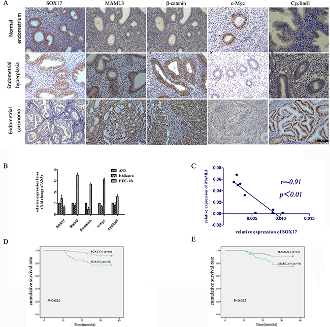 Figure 1: SOX17 expression is negatively correlated with MAML3 in EC patient samples and cell lines. IHC and real-time PCR were used to detect SOX17 and MAML3, respectively, in different samples. IHC analysis of SOX17, MAML3 and Wnt pathway proteins in normal endometrium, atypical hyperplasia and endometrial cancer tissues A. Error bar=50um, *P<0.05. Real-time PCR analysis of SOX17, MAML3 and Wnt pathway proteins in endometrial cancer cells B. Low SOX17 levels were correlated with increased MAML3, CyclinD1, c-Myc and β-catenin expression in EC cell lines. SOX17 and MAML3 were inversely correlated in human endometrial cancer cells (R=-0.91, P=0.001) C. In Kaplan-Meier analyses, patients with low SOX17-expressing (n=52, P=0.024) D. or high MAML3-expressing (n=76, P=0.022) E. tumors had poor overall survival. Results represent at least three separate experiments.