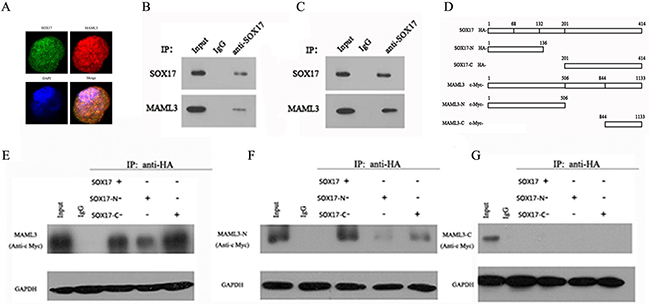 Immunoprecipitation was performed as previously described [32]. Protein A+G Agarose beads (40μl per reaction) were added (Beyotime, Jiangsu, China). Immunoprecipitated proteins were then subjected to SDS-PAGE and western blot analysis. Antibodies used for IP were as follows: SOX17 (abcam), MAML3 (abcam), HA (abcam) and c-Myc (abcam).