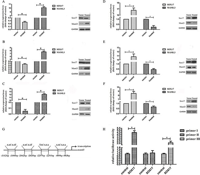 Figure 3: SOX7 inhibits MAML3 transcription. Real-time PCR and western blot assays were used to characterize MAML3 expression in SOX17-silenced AN3CA A. HEC-1B B. and Ishikawa C. cells and in SOX17-overexpressing AN3CA D. HEC-1B E. and Ishikawa F. cells. SOX17 putative binding site located -803 to −809 bp from the transcription start site in the MAML3 promoter region. G. ChIP analysis of SOX17 binding to MAML3 in HEC-1B cells H.