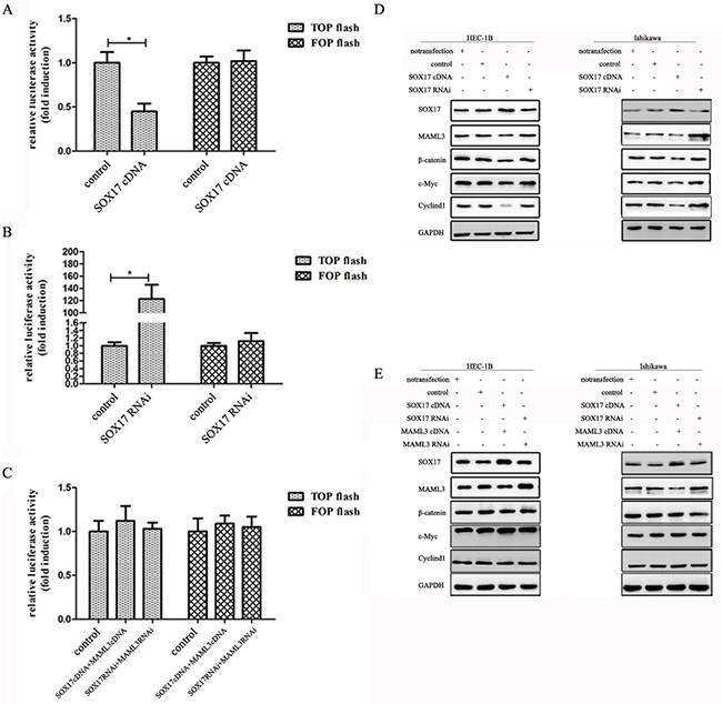Figure 4: SOX17 antagonizes the canonical Wnt pathway in HEC-1B cells. Cells were transfected with or without SOX17 cDNA together with the TCF-luciferase reporter (TOPflash) or mutant TCF-luciferase reporter (FOPflash) for 24 h. SOX17 knockdown repressed TOPflash activation in HEC-1B cells A. SOX17 overexpression increased TOPflash activation in HEC-1B cells B. SOX17/MAML3 co-transfection did not affect basal TOPflash activity C. HEC-1B and Ishikawa cells were transfected with SOX17 cDNA or shRNA alone or together with the MAML3 plasmid D. & E. Immunoblotting was performed on 10 μg of whole cell lysates. GAPDH was used as loading control.