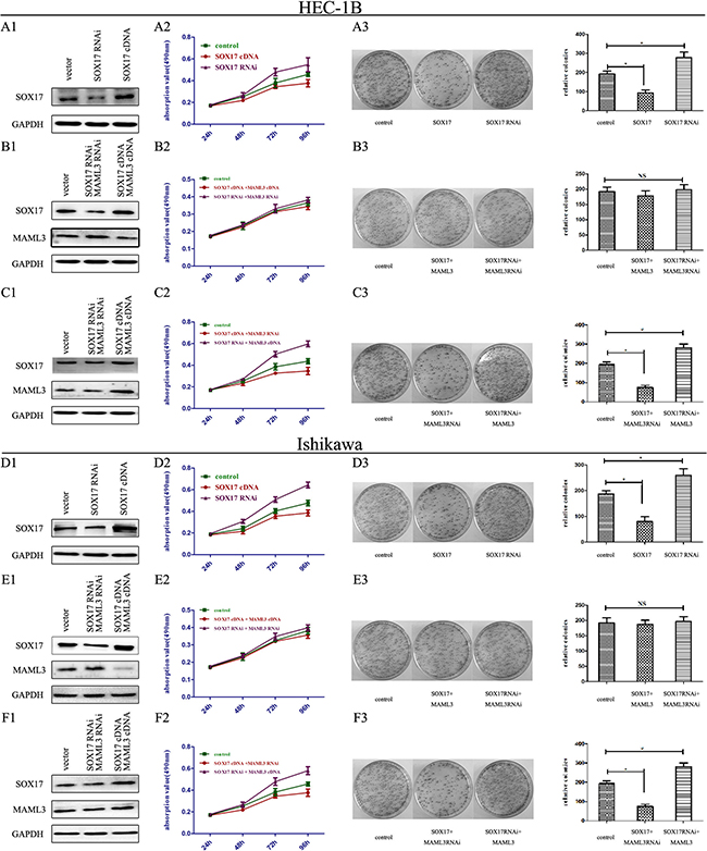 Finally, HEC-1B and Ishikawa cells co-transfected with MAML3 shRNA and SOX17 cDNA grew slower the controls and formed smaller colonies (Figure 5C1-5C3 & 5F1-5F3).