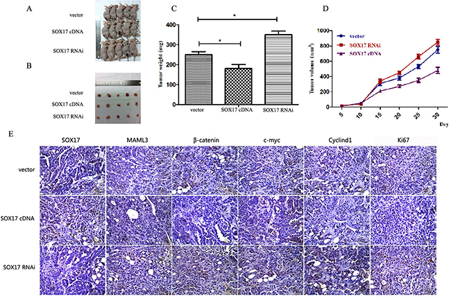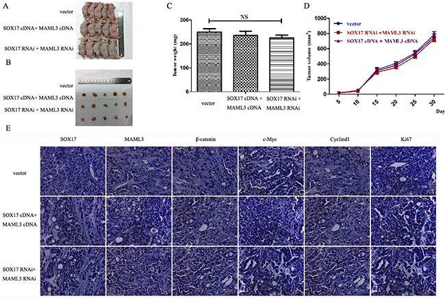 Stably transfected cells were subcutaneously transplanted into BALB/c nude mice. Cells were suspended at 5×106 cells/ml and 100 μl was injected into the flanks of nude mice (n=5). We measured tumor sizes starting 5 days post-injection using the formula (W2 × L) every 5 days for 32 days. Mice were then euthanized and tumors were excised. Tumor weights (Figure 6C) and sizes (Figure 6D) from SOX17-overexpressing cells were reduced compared to controls. Tumors from the SOX17-overexpression group exhibited significantly lower β-catenin, CyclinD1 and c-Myc levels compared with controls, as measured by western blot (Figure 6E). When SOX17 and MAML3 were co-overexpression or co-downregulated transfected tumors grew similarly to controls (Figure 7) (P>0.05)