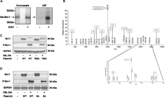 Figure 2: Phosphorylation of Mcl-1 on T92 by Cdk1 and analysis of Mcl-1 harboring mutations of Cdk consensus sites. A. His-tagged recombinant Mcl-1 was incubated under phosphorylation conditions with [γ-32P]ATP either in the absence or presence of purified active Cdk1/cyclin A2, as indicated, as described in Materials and Methods. Samples were resolved by SDS-PAGE and stained (Coomassie) and subjected to phosphor-image analysis (32P), as indicated. B. Identification of major phosphorylation site as T92. MS/MS spectrum of phosphorylated Mcl-1 peptide VARPPPIGAEVPDVTApTPAR (2093.07 Da monoisotopic molecular weight) with prominent b and y ions and neutral loss product indicated. The peak at 998.88 m/z is consistent with neutral loss of 79.97 Da characteristic of phosphorylation. The b16, b17-98, and b17 ions shown in the detail from 1550-1800 m/z indicate phosphorylation of Thr92. C, D. HeLa cells stably overexpressing wild-type (WT) or T92A (C) or 5A (D) Mcl-1 were untreated or treated with 30 nM vinblastine (VBL) for 24 h, and extracts immunoblotted for the proteins indicated. Parental HeLa cells are shown in the left lanes of each panel; endogenous Mcl-1 is only weakly detected under these conditions. GAPDH was used as a loading control.