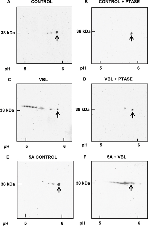 Cell extracts were prepared by lysing cells under nondenaturing conditions in 40 mM HEPES (pH 7.5), 120 mM NaCl, 50 mM NaF, 1% Triton X-100, 1 mM EDTA, 1% aprotinin, 50 μg/mL leupeptin, 1 mM phenylmethylsulfonyl fluoride. Aliquots of 100 μg were incubated with 400 U of lambda protein phosphatase in 25 μL phosphatase buffer (50 mM Tris-HCl, pH 7.5, 0.1 mM EDTA, 5 mM DTT, 0.01% Brij 35, and 2 mM MnCl2) at 30°C for 30 min. The samples were precipitated by the addition of trichloroacetic acid to 25% v/v, dissolved in rehydration buffer and analyzed by 2D PAGE/immunoblotting as described above.