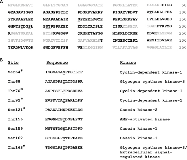 In order to identify the sites of Mcl-1 phosphorylation associated with mitotic arrest, Mcl-1 was purified by preparative immunoprecipitation from synchronized, vinblastine treated HeLa cells, as described in Materials and Methods. Because this type of phosphorylation leads to ubiquitination and proteosome-mediated degradation [17, 19] (Figure 1C), the proteosome inhibitor MG132 was added 2 h before harvest to protect Mcl-1. Analysis of the preparative Mcl-1 immunoprecipitate by SDS-PAGE and Coomassie Blue staining is shown in Supplementary Figure S2A. Several prominently staining bands were evident which were presumed to be protein A/G and light and heavy chains from IgG. A stained band of the expected molecular mass of ~40 kDa was observed (marked by an asterisk in Supplementary Figure S2A), excised, and subjected to tandem MS (MS/MS) using an LTQ Orbitrap Velos mass spectrometer, as described in Materials and Methods. To identify peptides, a UniProt database search using Mascot was run, and Scaffold was then used to validate MS/MS-based identifications. Peptide identifications were accepted if they were scored at ≥ 95% probability by the Scaffold local false-discovery rate (FDR) algorithm. Peptides corresponding to Mcl-1 were observed, with overall sequence coverage of 63% (Figure 4A). MS/MS spectra corresponding to phosphopeptides were also manually validated for unambiguous site localization. Nine phosphorylation sites meeting the FDR algorithm threshold were identified; these were S64, T68, T70, T92, S121, T156, S159, S162, T163 (Figure 4A, 4B). Five of these sites were manually validated (Figure 4B); the corresponding MS/MS spectra are shown in Supplementary Figure S2, panels B-H. Importantly, the total number of sites identified through MS analysis was consistent with data derived from 2D-PAGE analysis. Furthermore, the same nine sites were predicted when the human Mcl-1 sequence was scanned for phospho-motifs (http://scansite3.mit.edu). The kinase(s) whose recognition motifs best match each site is shown in Figure 4B, and similar information was obtained by searching other kinase/phospho-motif databases. Three of the sites are novel and, to our knowledge, have not been reported previously (T68, T70, T156), and the others are established with various kinases ascribed to them [7], with the exception of S162 which was more recently reported [24].