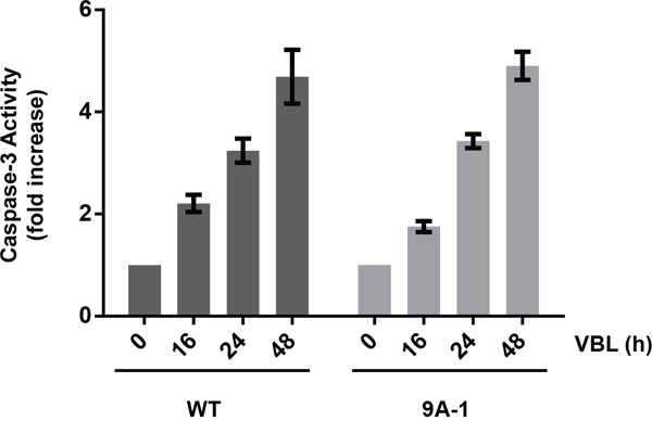 Figure 6: Caspase-3 activation in HeLa cells expressing Mcl-1-9A. HeLa cells expressing wild-type (WT) or Mcl-1-9A were treated with 30 nM vinblastine (VBL) for the indicated times, and extracts subjected to caspase-3 assay, as described in Materials and Methods. Results are shown as fold-activation relative to untreated cells, and represent mean ± S.D. (n = 6).