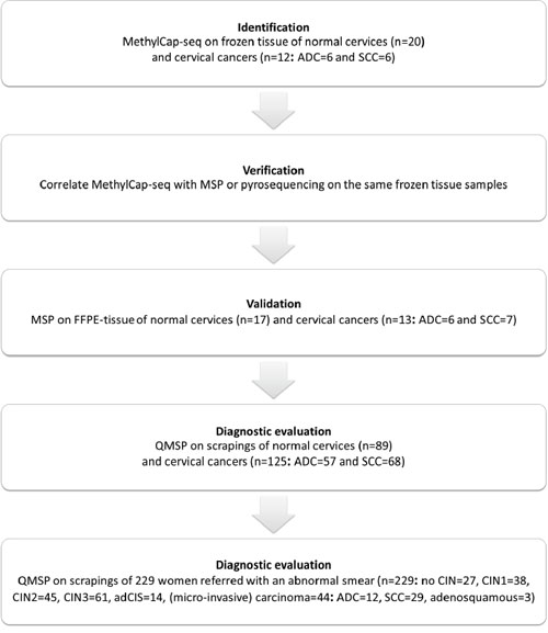 Until now, no cervical cancer DNA methylome analysis has been performed using ADC. In this study, MethylCap-seq was applied to perform a genome-wide DNA methylation screening of cervical cancer, including both ADC and SCC, and normal cervix tissues. With this approach, we sought to identify genome-wide aberrant methylation patterns of cervical cancer-specific markers with high sensitivity to detect both ADC and SCC and their precursors in cervical scrapings.
