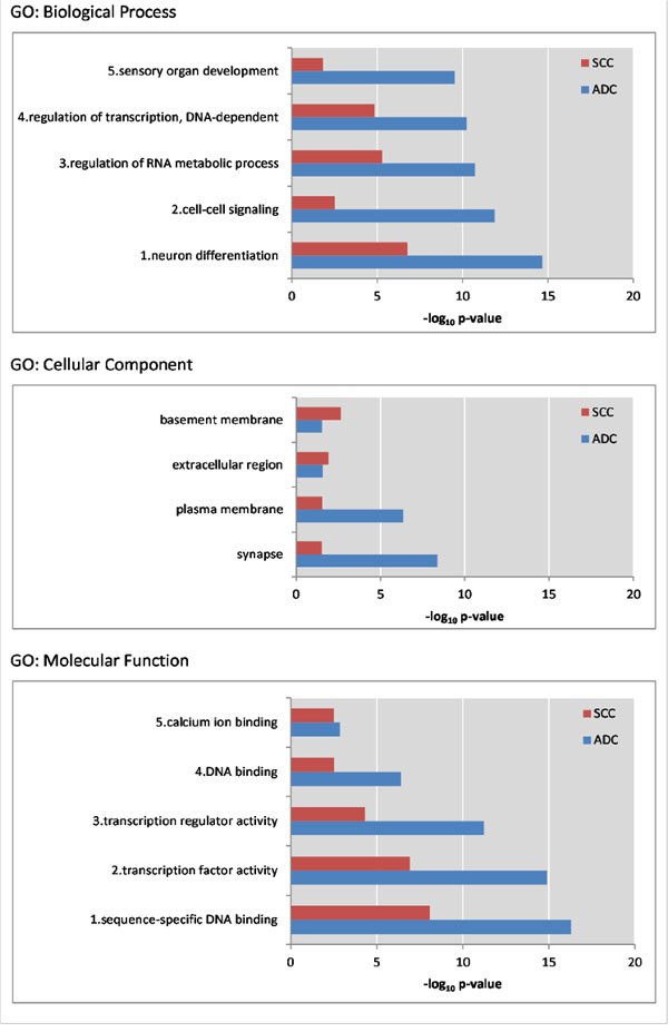 Figure 4: For three GO themes the five most significant GO terms enriched in ADC are shown along with the P-value of that term in SCC. Within the cellular component GO terms, only 4 terms were significant in both ADC and SCC. All depicted P-values are below 0.05.
