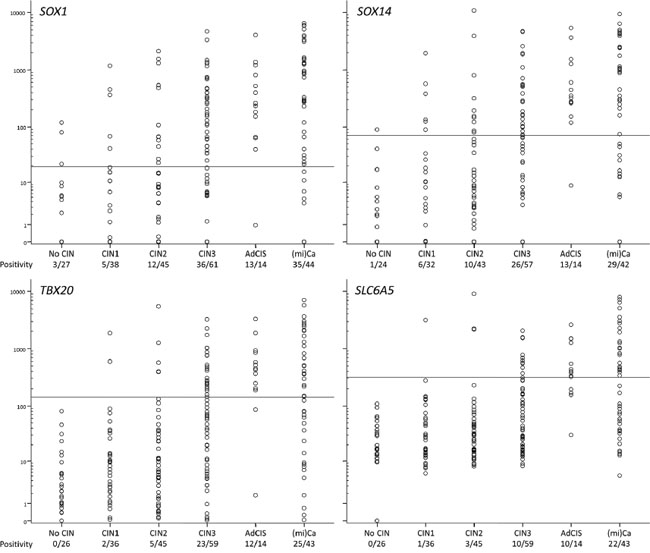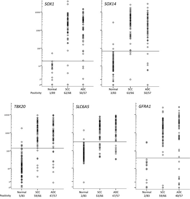 Figure 5: DNA methylation levels in normal and cancer scrapings determined by QMSP. The horizontal lines represent optimal thresholds (see Table 2). The positive rate is depicted below the class labels.