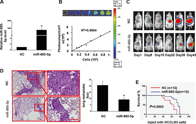 Figure 4: Overexpression of miR-885-5p inhibits proliferation of HCCLM3 cells in vivo and prolongs the survival of tumor-bearing Mice. (A–D) HCCLM3-lv- miR-885-5p or HCCLM3-lv-NC tumor-bearing mice were euthanized after 43 days, and the lungs were histologically examined for metastatic foci. (A), miR-885-5p expression levels of HCCLM3-lv-miR-885-5p and HCCLM3-lv-NC cells. (B), Ex vivo imaging analysis of transfected HCCLM3 cells indicates increasing bioluminescence signals with increasing cell number (R2 = 0.9904). (C), In vivo imaging of tumors over 43 days. (D), Number (mean ± SD) of lung metastatic foci was determined from five serial sections. Values shown are expressed as mean ± SD. The scale bars = 100 μm. *P < 0.05. (E), Survival curve for mice injected with HCCLM3 cells expressing miR-885-5p or NC control (negative control) as determined by Kaplan-Meier analysis.
