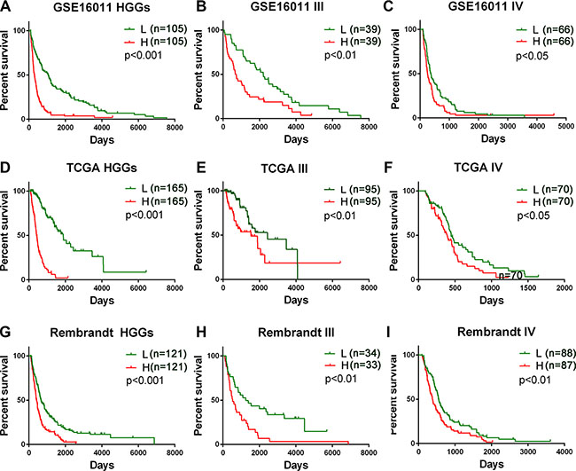 Figure 1: Prognostic value of the five B cell-associated gene signature for glioma patients in training and validation datasets. Patients in the low risk group showed a better survival than those in the high risk group according to the signature risk score in GSE16011 dataset (A–C), TCGA dataset D–F), and Rembrandt dataset (G–I). L, low risk group; H, high risk group; III, WHO grade III; IV, WHO grade IV; HGGs, high grade gliomas.