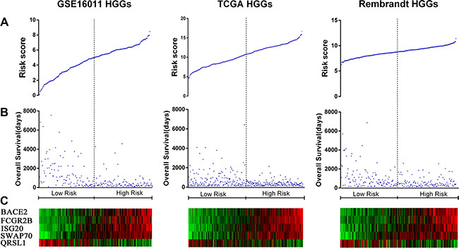 Figure 2: Distribution of risk scores of HGGs and OS of their patients based on the five signature genes in the three datasets. (A) Risk score distribution among HGGs. (B) Patient overall survival among HGGs. (C) Expression of five signature genes among HGGs.