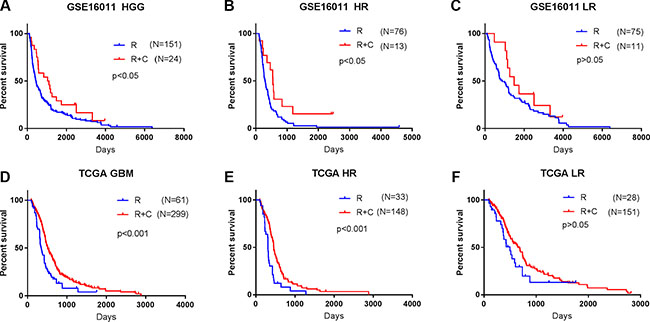 Figure 3: The signature assisted predicting the efficacy of radiotherapy with or without chemotherapy in HGG patients. (A, D) HGG patients in GSE 16011 and GBM patients in TCGA treated with CRT showed a better prognosis than those with RT alone. (B, E) Benefit of CT was observed in the high risk group with significantly improved OS (p < 0.05). (C, F) The addition of CT to RT did not improve OS of patients in the low risk group (p > 0.05). R, radiotherapy; R + C, radiotherapy + chemotherapy; LR, low risk group; HR, high risk group.