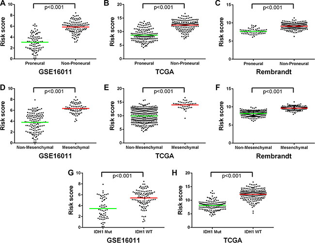 Figure 5: The low and high risk score HGGs exhibited distinct TCGA molecular subtypes and IDH1 mutation status. (A–C) The Proneural subtype was preferentially stratified into the low risk group. (D–F) The Mesenchymal subtype was mainly stratified to the high risk group. (G, H) The IDH1 mutation was dominant in the low risk group while the wild-type IDH1 preferentially present in the high risk group. Each spot represents the risk score of the individual HGG. Line in the middle was the mean value of the risk score.
