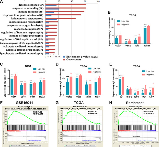 Figure 6: Functional annotation of the high risk versus the low risk group. (A) GO analysis revealed that 416 genes with increased expression in the high risk group were mainly related to immune response. Red column height: gene counts; blue column height: enrichment p value. BP, biological process. (B) Genes encoding immunosuppressive factors TGF-β, IL10, CD274 (protein name PDL1), and FASLG (FASL) were highly expressed in the high risk group. (C, D) MDSC marker genes (ITGAM (CD11b), CD14, FUT4 (CD15), and CD33) and M2 microglia/macrophage marker genes (CD68, CD163, MSR1 (CD204), and MRC1 (CD206)) were significantly up-regulated in the high risk group. (E) Tregs marker genes (CD4, IL2RA(CD25), ICOS, IDO1, and FoxP3) showed increased expression in the high risk group. (F–H) The enrichment plots of the gene expression related to inhibiting activation and differentiation of CD8+ T cells to cytotoxic CD8+ T cells were separated between the low and high risk score groups. Class A, the high risk group; Class B, the low risk group; NES, Normalized Enrichment Score; FDR, False Discovery Rate.*P < 0.05; **P < 0.01; ***P < 0.001.